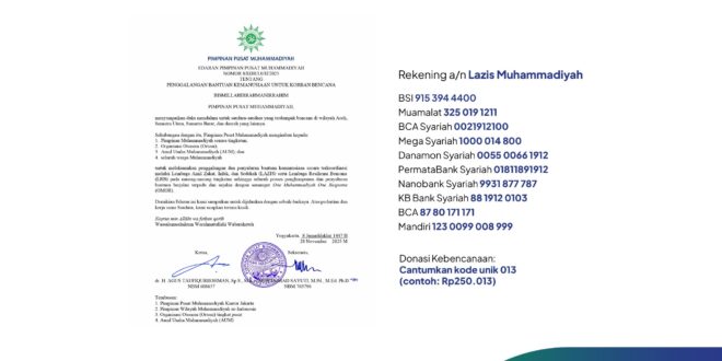 Lebih lanjut, ia meminta seluruh struktur organisasi Muhammadiyah, termasuk Ortom dan Amal Usaha Muhammadiyah, untuk menyalurkan bantuan melalui LAZIS Muhammadiyah serta Lembaga Resiliensi Bencana (LRB/MDMC) guna memastikan distribusi bantuan berlangsung efektif sesuai konsep One Muhammadiyah One Response (OMOR).